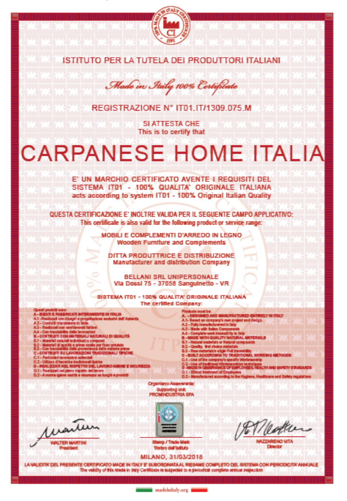 Ideea esențială nu este doar de a vinde piese de mobilier, ci de a oferi clienților o experiență de viață, un concept de atmosfera cu totul nou, născut din bun gust și pasiune . În 1990, Marco Bellani a fondat Carpanese Home Italia, o afacere de familie, cu scopul de a crea cel mai luxos mobilier de interior, folosind doar cele mai bune materiale disponibile, combinând metodă de construcție tradițională și designul inovator. Acest contrast este posibil datorită viziunii lui Bellani, care a dorit să păstreze tehnicile tradiționale de construcție, dar a dorit să continue să se îmbunătățească și să găsească noi modalități de a crea piese care au devenit atemporale.