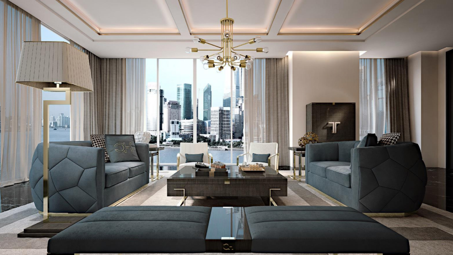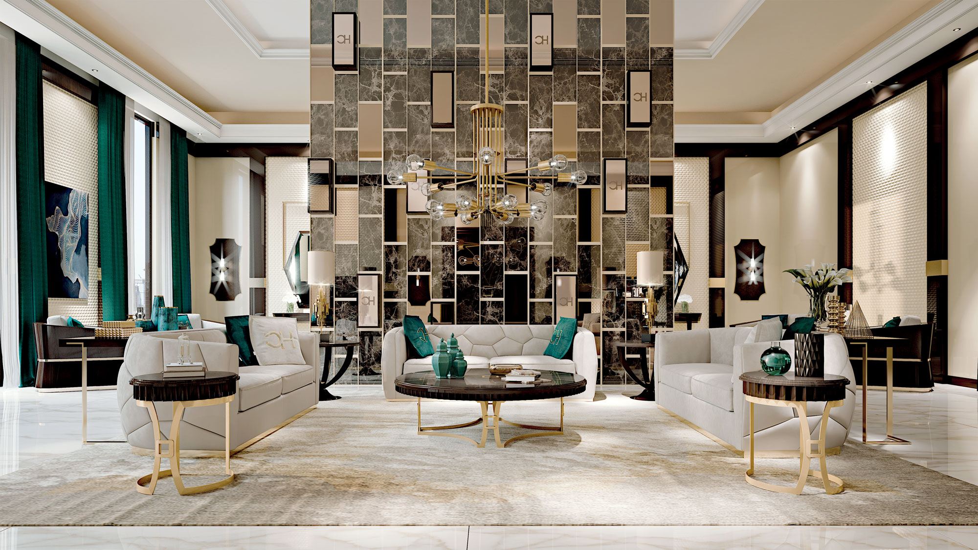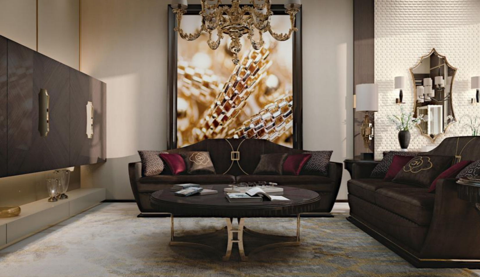 Stil contemporan cu aroma Art Decó. Finisaje splendide, pictate manual, cu detalii aurii.